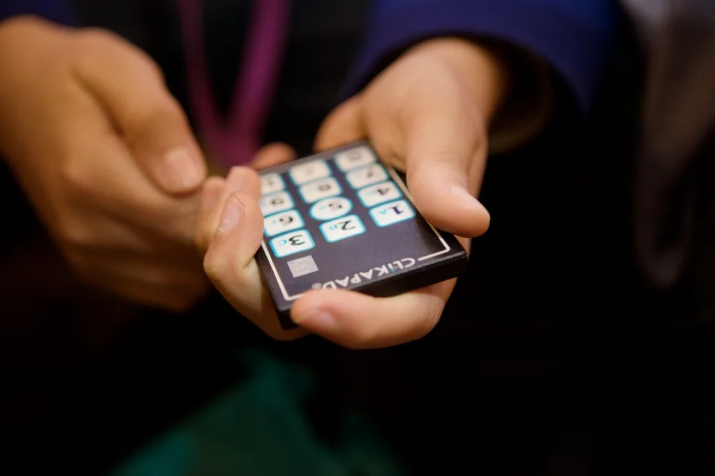 Candidates use digital pads to respond to blocks of multiple choice questions set at intervals throughout each course, focusing on specific topics.